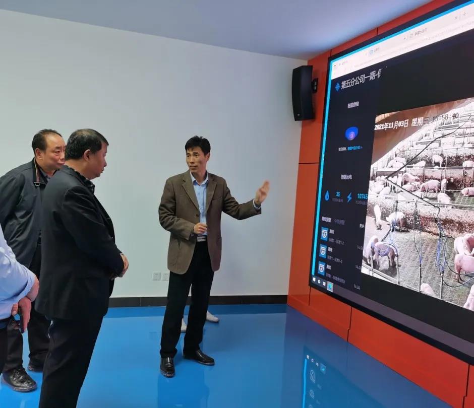 劉軍一行深入公司生豬產(chǎn)業(yè)技術(shù)中心,詳細(xì)了解了中心通過AI巡檢、智能環(huán)控、智能能耗、精準(zhǔn)飼喂、智能盤估、生產(chǎn)數(shù)據(jù)平臺等實(shí)現(xiàn)豬場遠(yuǎn)程可視化的管理模式,現(xiàn)場聽取了生豬疫病檢測中心工作情況及未來規(guī)劃的匯報(bào)。