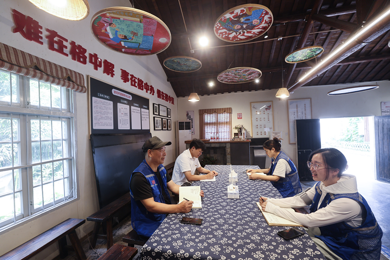 在浙江省諸暨市東白湖鎮(zhèn)婁東村,鎮(zhèn)、村干部與村民們在家風家訓宣講亭開展民主懇談,交流民生實事項目并征詢村民意見建議(2023年7月26日攝)。新華社記者 徐昱 攝