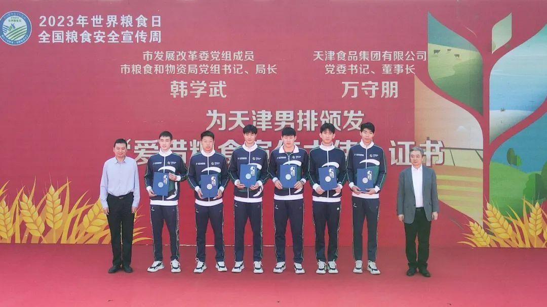 韓學(xué)武、萬(wàn)守朋為天津食品集團(tuán)男排頒發(fā)“愛惜糧食宣傳大使”證書。旨在進(jìn)一步宣傳節(jié)約光榮、浪費(fèi)可恥的思想觀念,倡導(dǎo)全民健身活動(dòng),倡導(dǎo)健康文明的新生活方式。