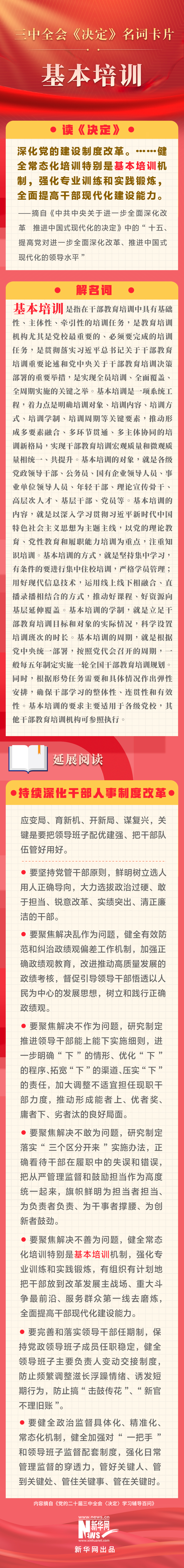 黨的二十屆三中全會(huì)審議通過(guò)了《中共中央關(guān)于進(jìn)一步全面深化改革、推進(jìn)中國(guó)式現(xiàn)代化的決定》。新華網(wǎng)依據(jù)《黨的二十屆三中全會(huì)〈決定〉學(xué)習(xí)輔導(dǎo)百問(wèn)》,制作三中全會(huì)《決定》系列名詞卡片,和大家一起來(lái)深入學(xué)習(xí)領(lǐng)會(huì)二十屆三中全會(huì)精神。本期名詞是“基本培訓(xùn)”。