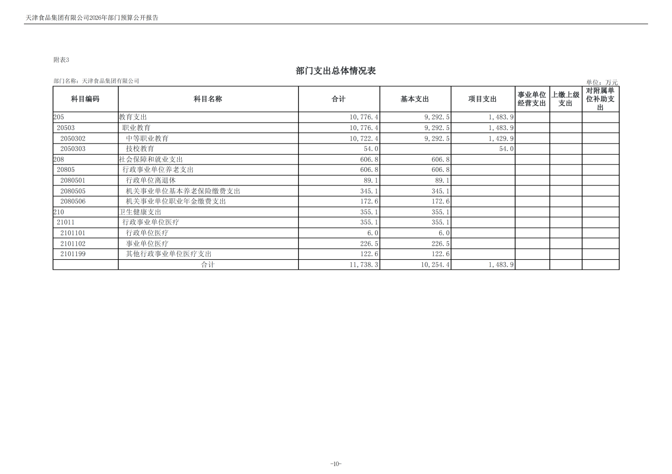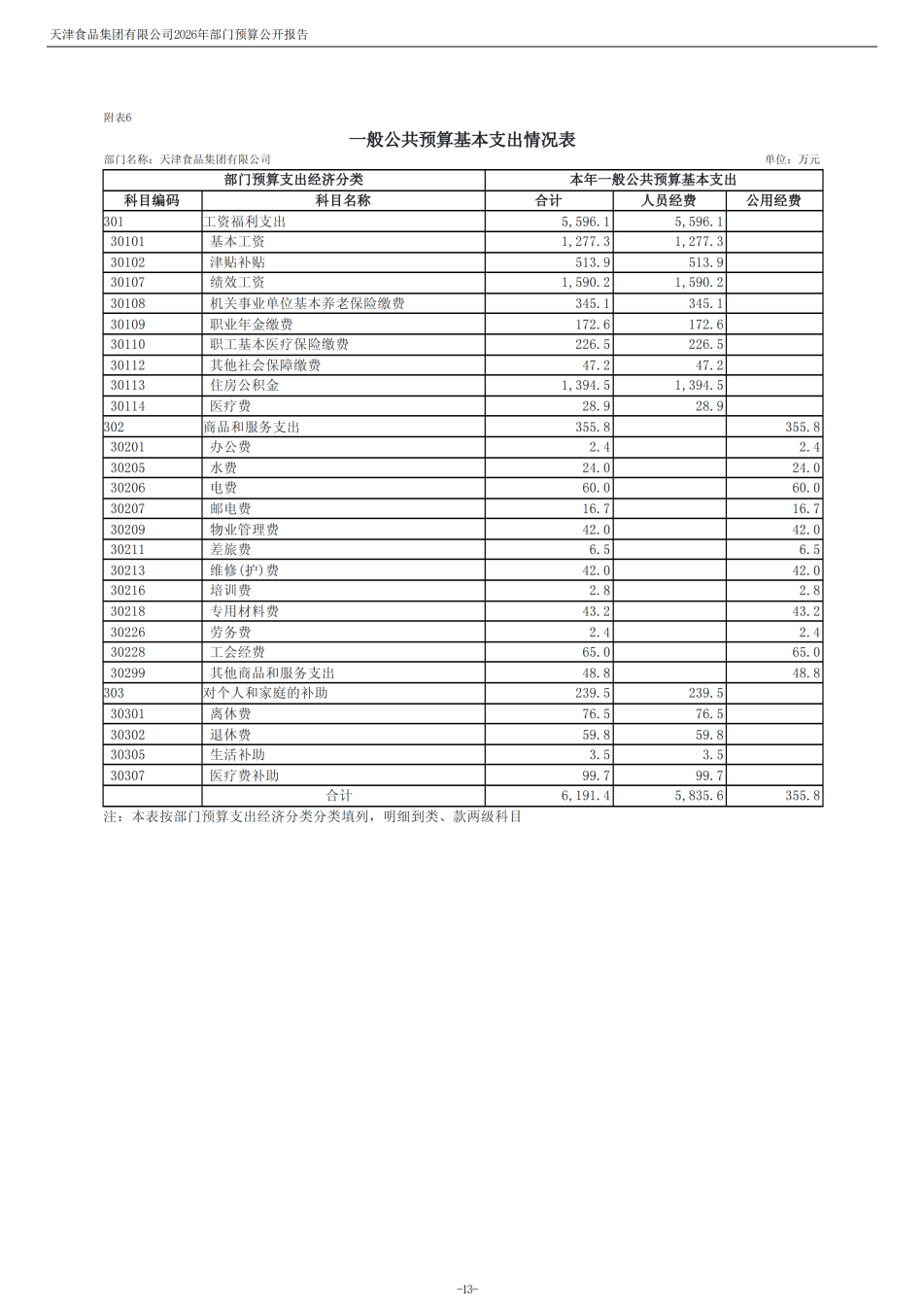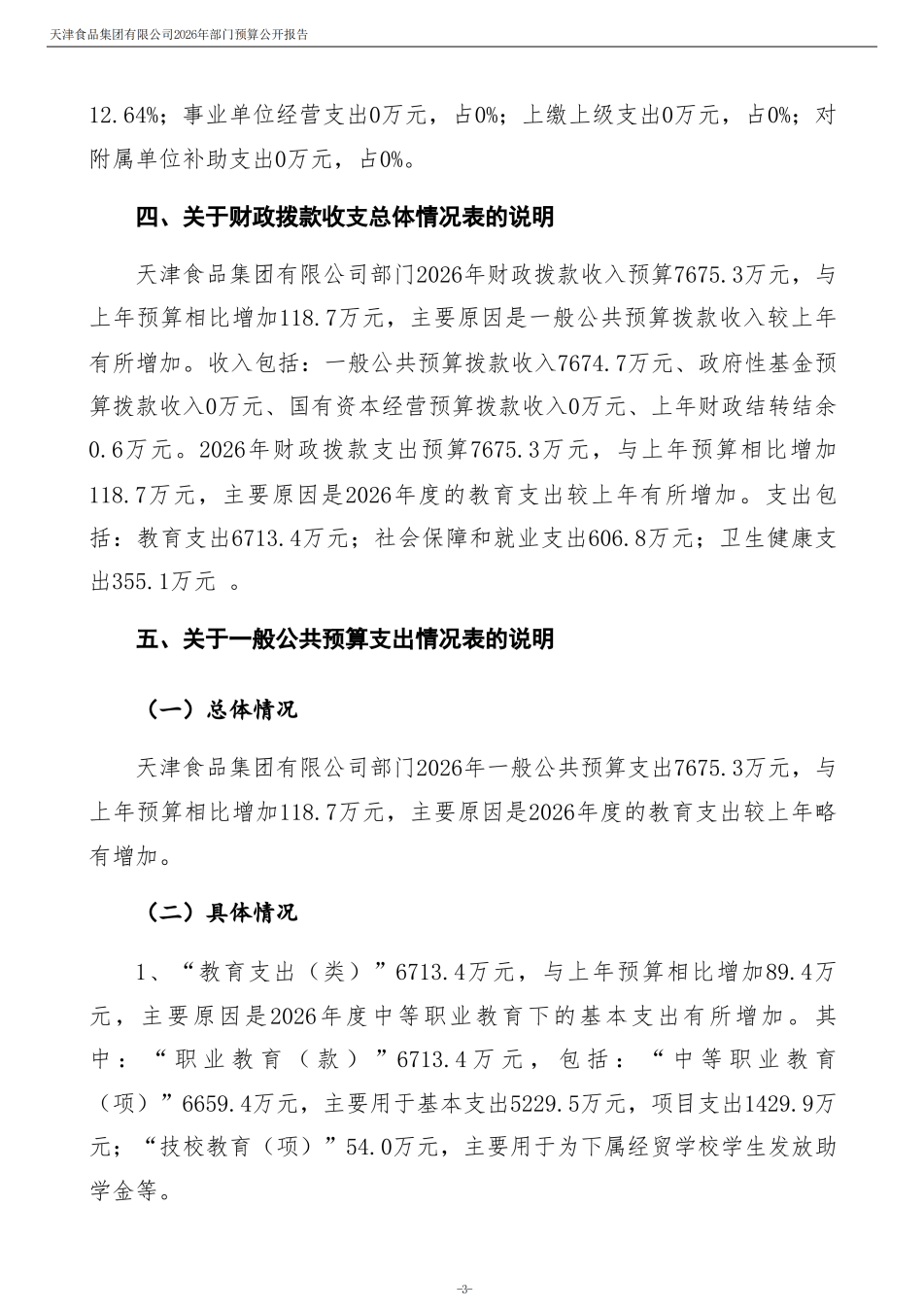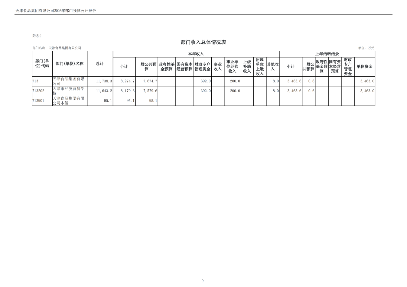 天津食品集團有限公司2026年度部門預算